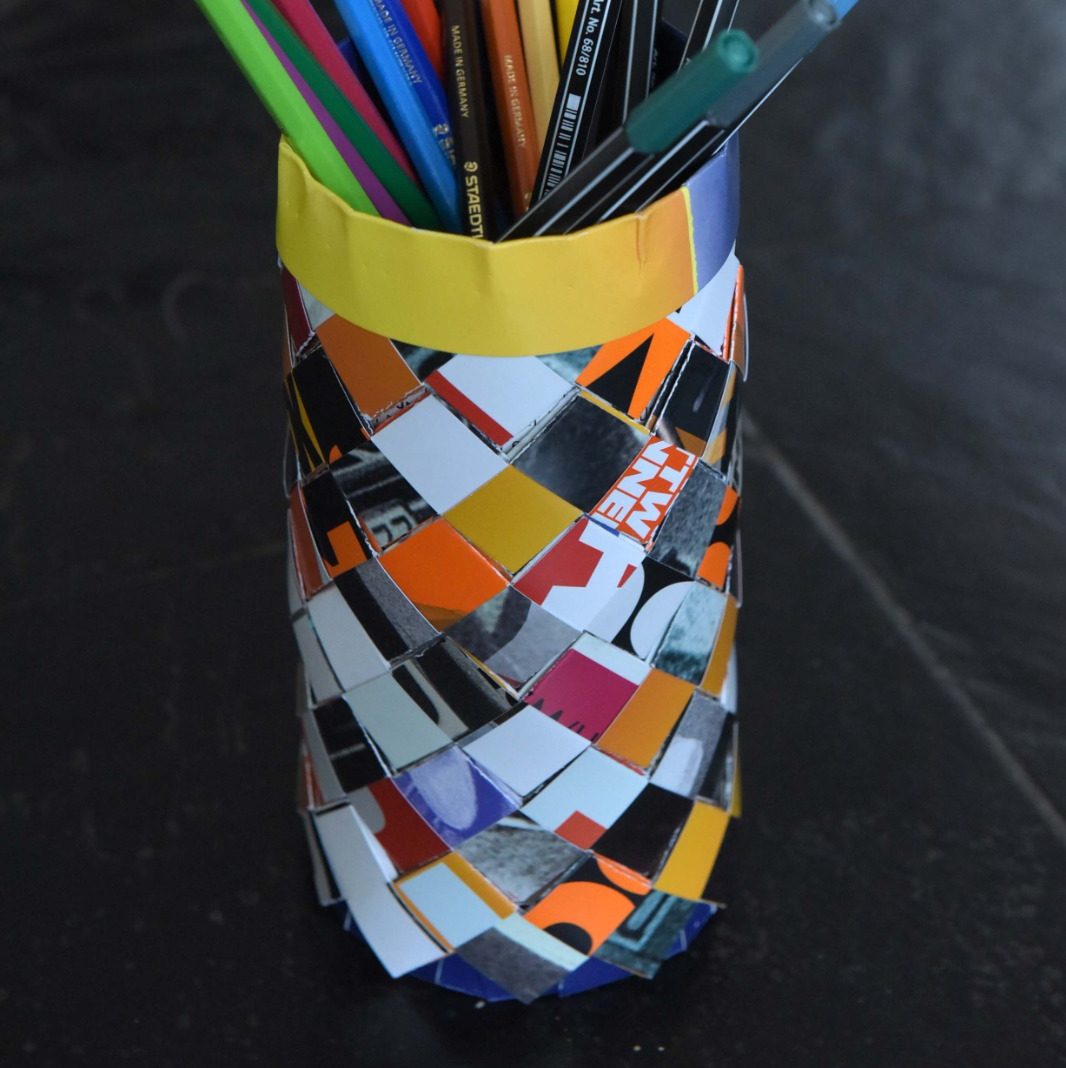 Abgelaufene Kalender der vergangenen Jahre sind eine wertvolle Ressource: In Streifen geschnittenes und gefaltetes Kalenderpapier wird u. a. in individuelle Papierkörbe, Aktenmappen oder Taschen verwandelt.