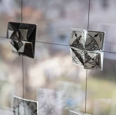 Unterschiedliche Papiere werden zu filigran gestalteten Teilchen, die in einen Rahmen gesetzt und mit Abstand aufgefädelt sind, um den Lichteinfall zu erhalten. So erhält das Fenster eine kunstvolle Dekoration und ist zugleich ein leichter Sichtschutz.